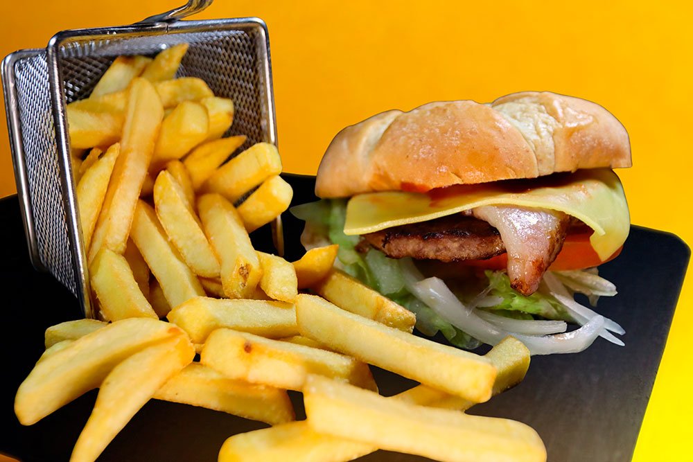 Hamburguesa de Carne acompañado de patatas fritas.