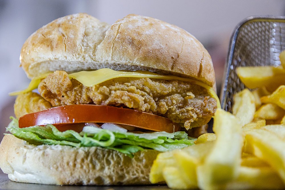 Hamburguesa de Pollo acompañado de patatas fritas.